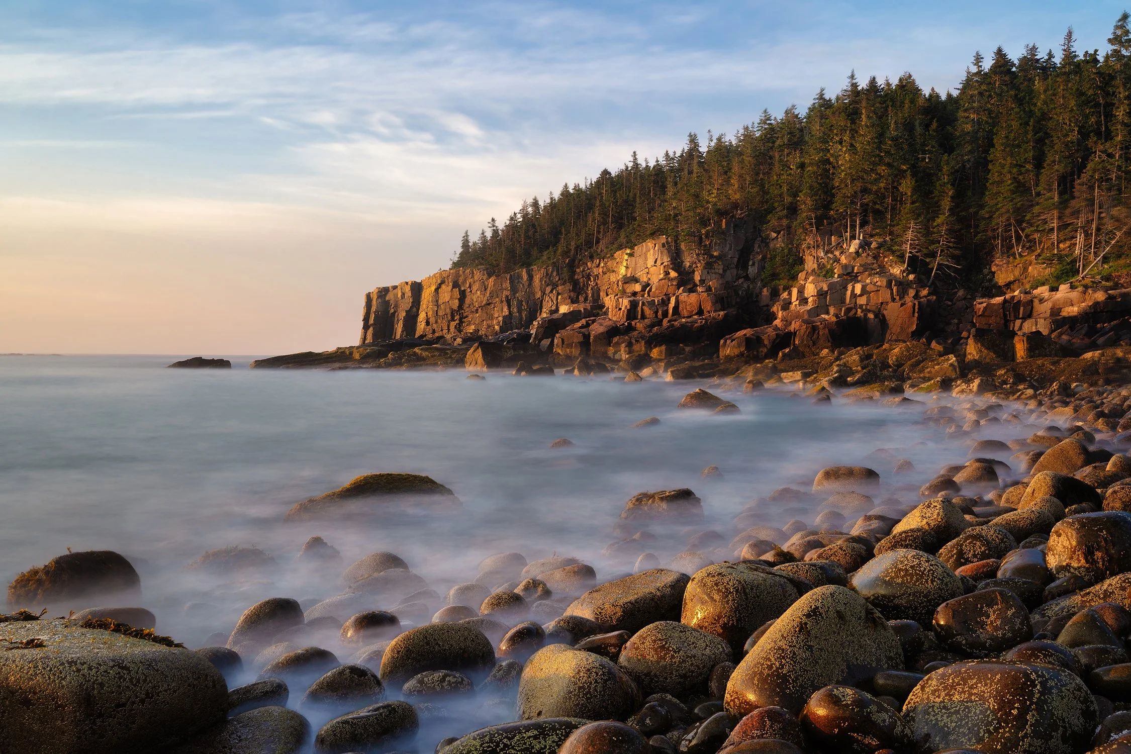 Coastal scene with rocky shoreline, ocean waves, and a forested cliffs in the background during sunset.